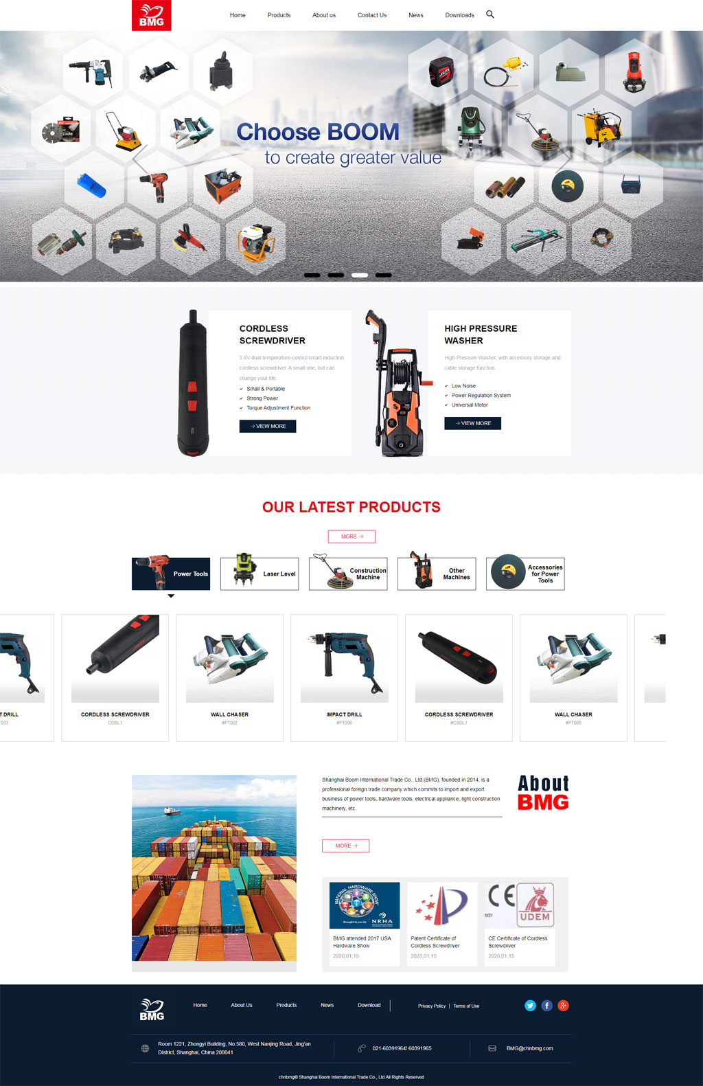 Shanghai Boom International Trade Co , Ltd (BMG), founded in 2014, is a professional foreign trade company which commits to import and export business of power tools, hardware tools, electrical appliance, light construction machinery, etc
